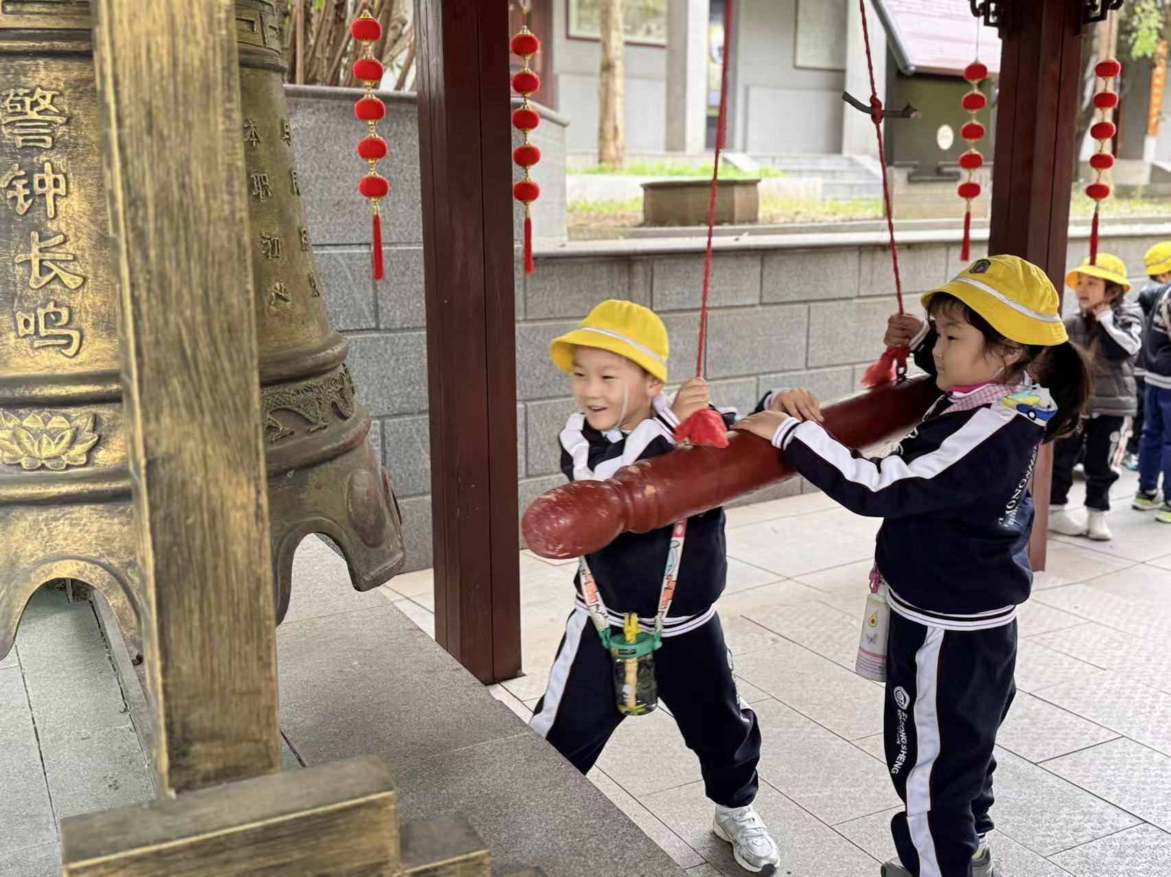 当当当,敲响秋天的钟声,最庄严的时刻,莫过于敲响那口古钟。孩子们踮起脚尖,用力推动钟杵“当——”浑厚的钟声在山谷间回荡,惊起几只鸟。那一刻,每张小脸都写满了专注与虔诚,仿佛在和百年前的历史对话。钟声里,有孩子们对秋天最响亮的问候。