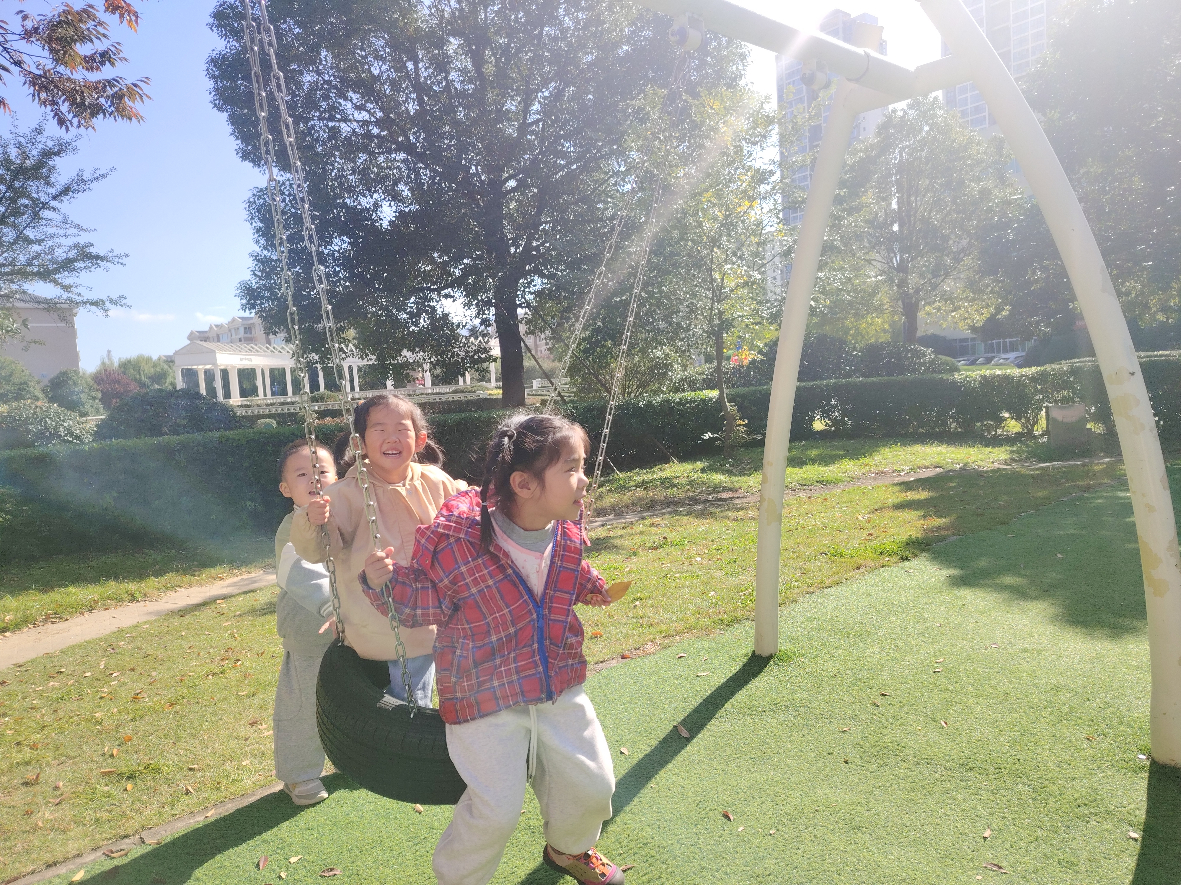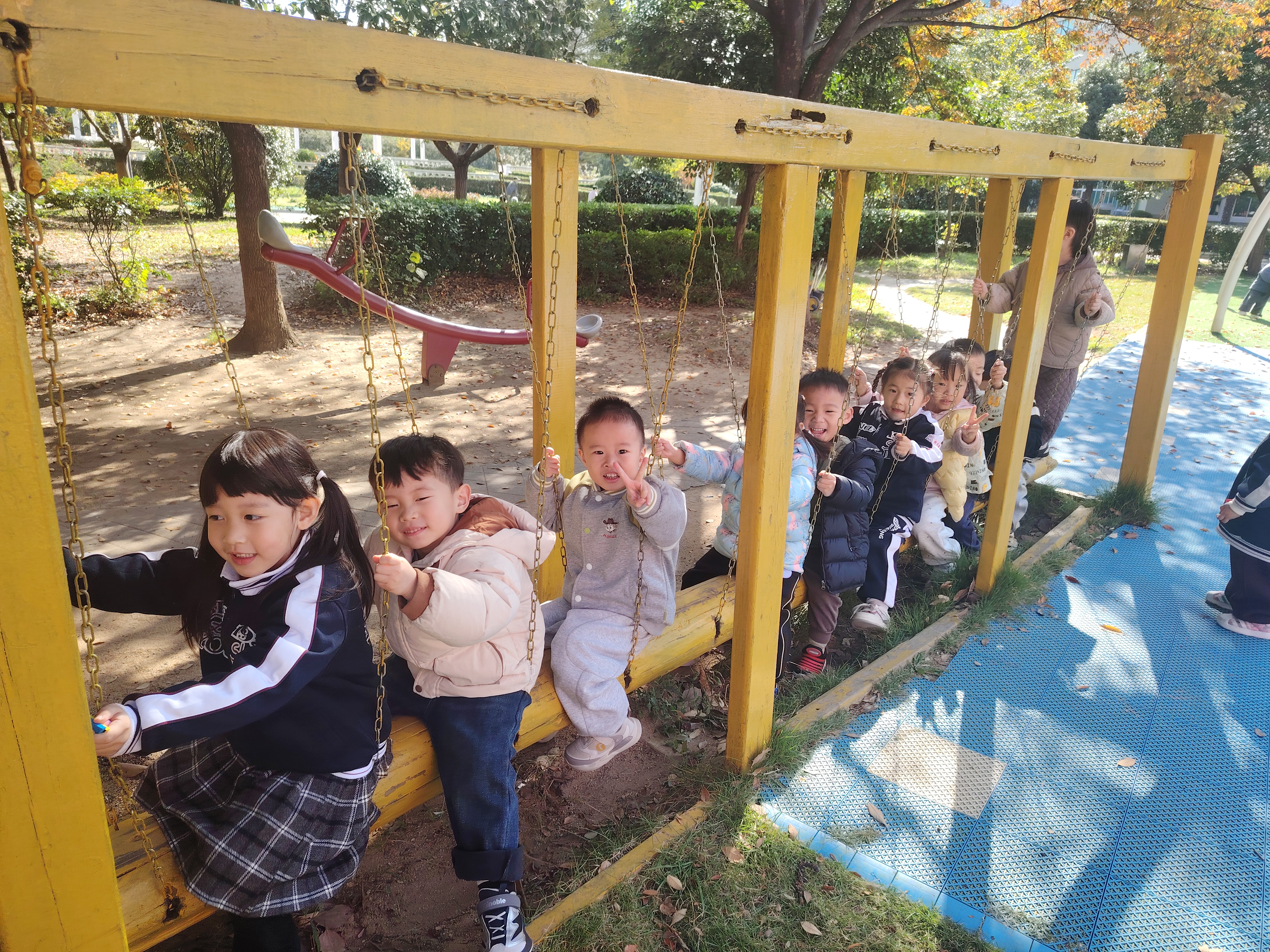 再瞧瞧秋千,那是孩子们心中的“快乐飞车”。小朋友们坐在秋千上,小脚用力一蹬,就像火箭发射一样飞出去啦!他们在空中笑得合不拢嘴,还喊着:“我要飞得更高!”风把他们的笑声吹得远远的,感觉整个天空都被他们的快乐填满啦。