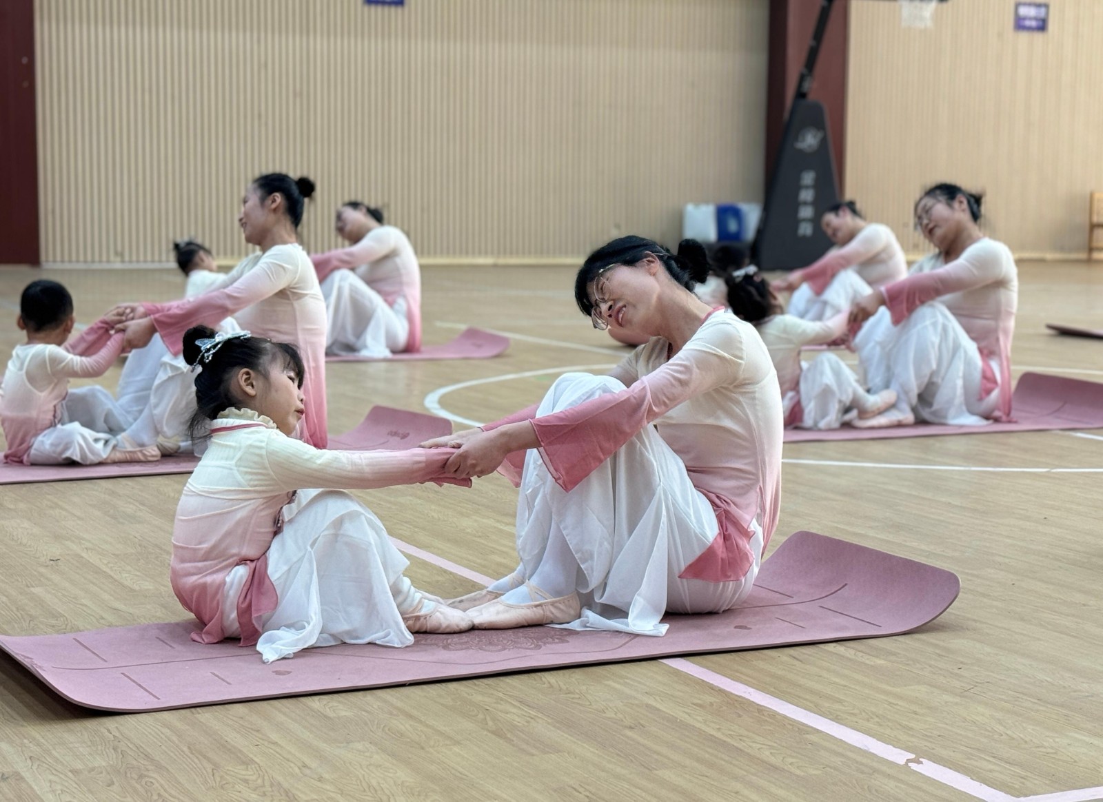在熟悉的旋律中,妈妈们不再是单纯的“保护者”,而是化为了稳定而温柔的大地。她们盘膝而坐,脊背挺拔,如同宁静的山脉。而孩子们,这些平日里活泼好动的小精灵,此刻却化身为依偎在山旁的小树,或是在花间休憩的蝴蝶。