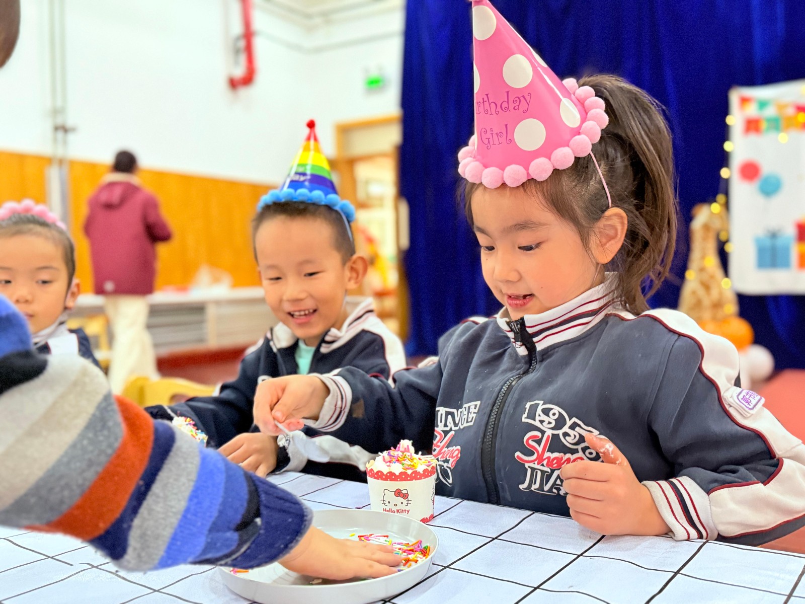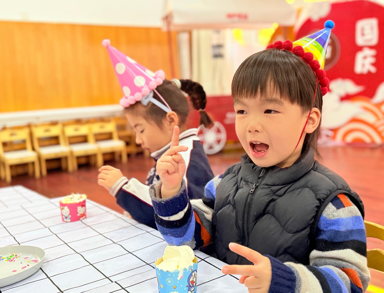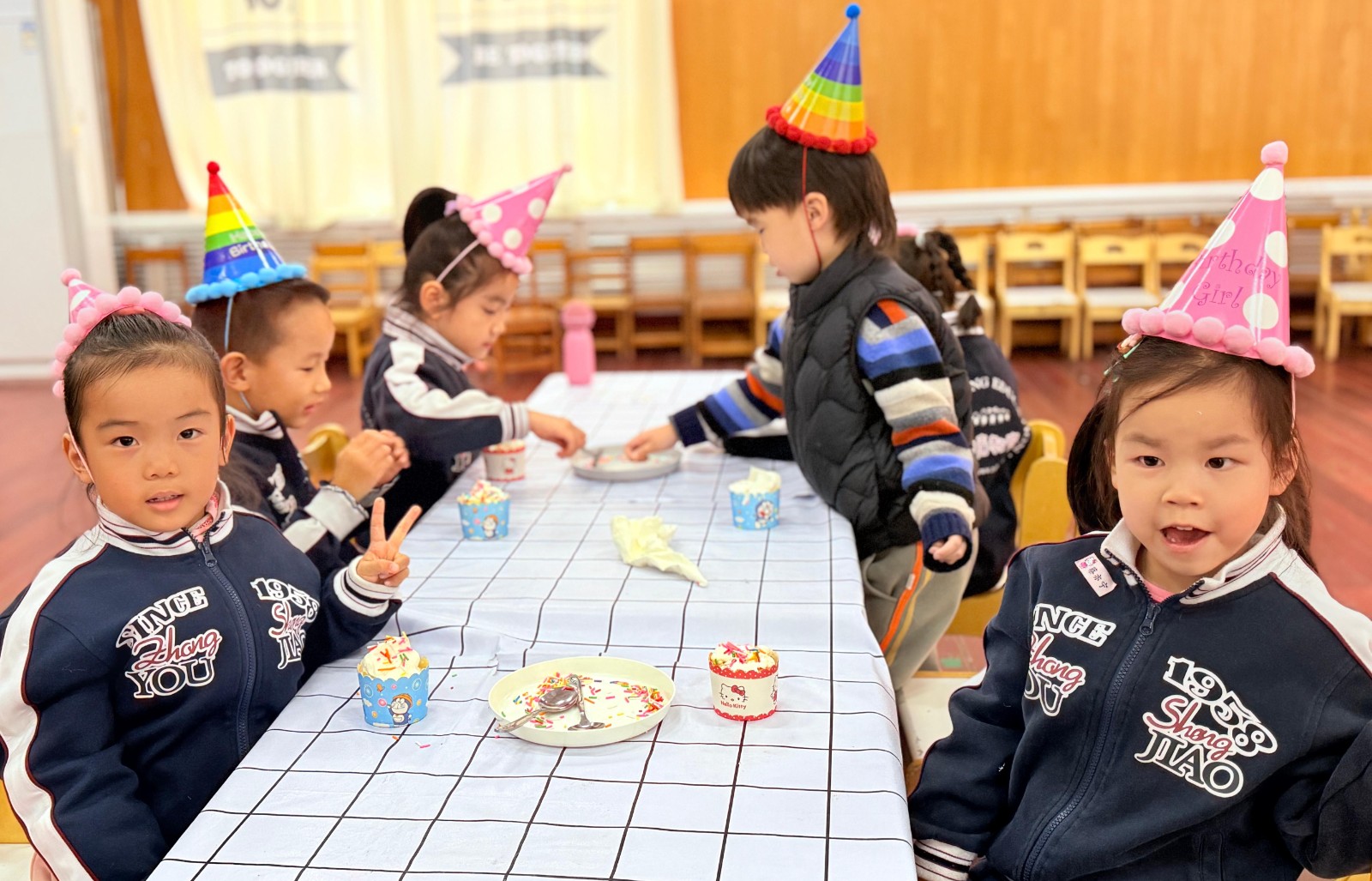 今天的幼儿园格外热闹。走廊上飘着淡淡的奶油香气,小朋友们的笑声像清脆的风铃,在空气中跳跃。迎来了小朋友们期待已久的集体生日会。走进布置一新的活动室,每张桌子上都摆放着各式各样的蛋糕装饰材料:五颜六色的糖珠、巧克力豆、水果切片、奶油花袋,还有小巧的纸杯蛋糕底座。孩子们戴上生日帽,瞬间变身小小糕点师。他们的眼睛亮晶晶的,兴奋地等待着动手制作属于自己的生日蛋糕。