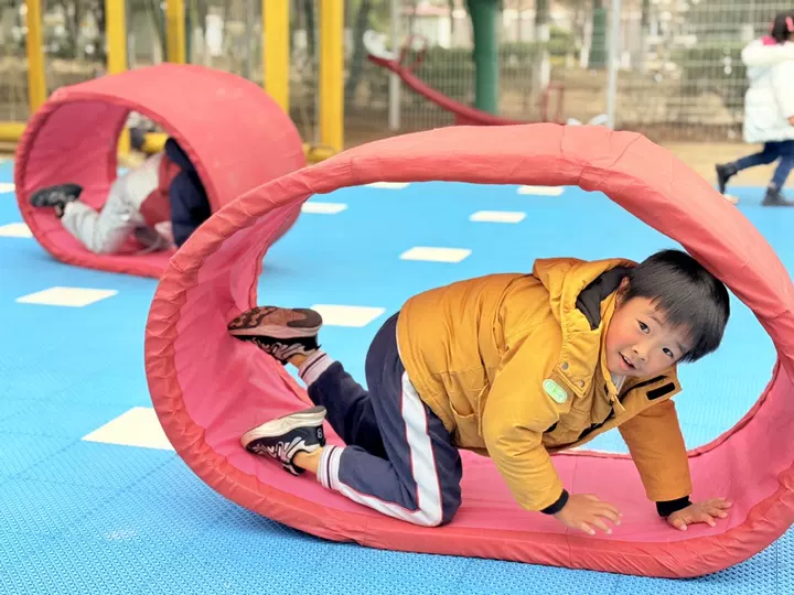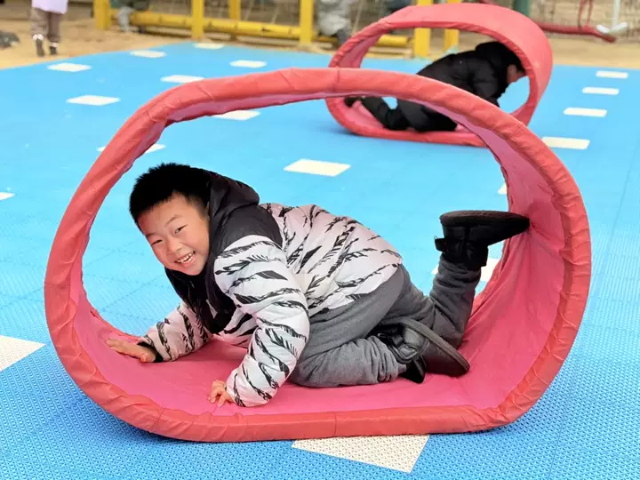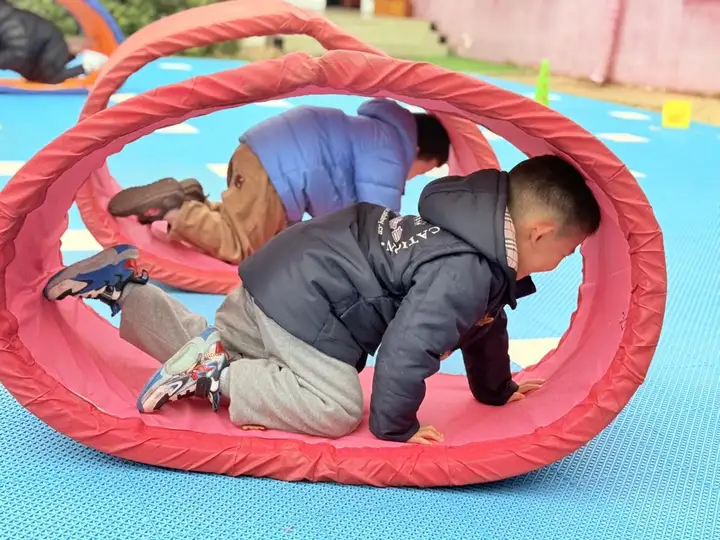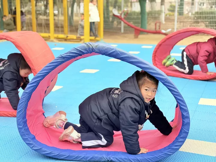 看!宝贝们趴在坦克垫里,小手用力撑地,小脚使劲蹬,一点点往前“钻山洞”。有的宝贝速度飞快,像小火箭一样穿过隧道,脸上扬起得意的笑容;有的宝贝慢慢探索,眼神里满是好奇,每一步都透着认真。彩色的坦克垫在宝贝们的摆弄下滚动起来,搭配着他们清脆的笑声,成了幼儿园里最亮眼的风景线。
