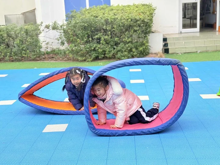 户外的蓝色塑胶场地上,彩色的坦克垫像一个个可爱的“魔法隧道”,我们的宝贝们化身小小探险家,开启了一场超有趣的坦克垫闯关大冒险~