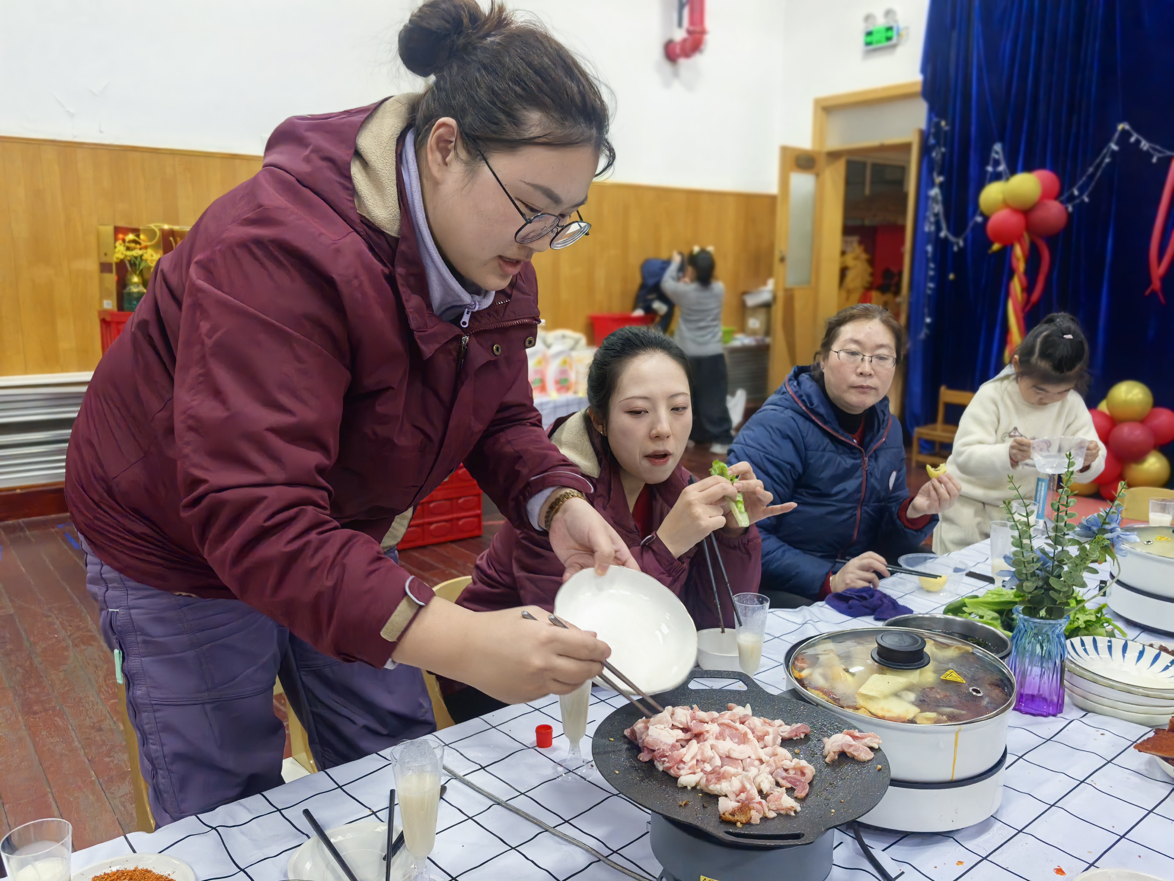 温情之外,是烟火气的欢愉。长桌铺着简约的格纹桌布,向日葵插花迎着光绽放,一锅锅热气腾腾的火锅咕嘟作响,红油汤底的鲜香与食材的清甜交织,成了冬日里最治愈的味道。金黄酥脆的炸物摆成精致的扇形,肉丸、鲜蔬、冷盘错落有致,老师们围坐一桌,添菜、畅谈、欢笑,平日里的工作搭档,此刻成了推杯换盏的知己。那些忙碌时来不及说的心里话,那些藏在日常里的小感动,都在烟火氤氲中娓娓道来。