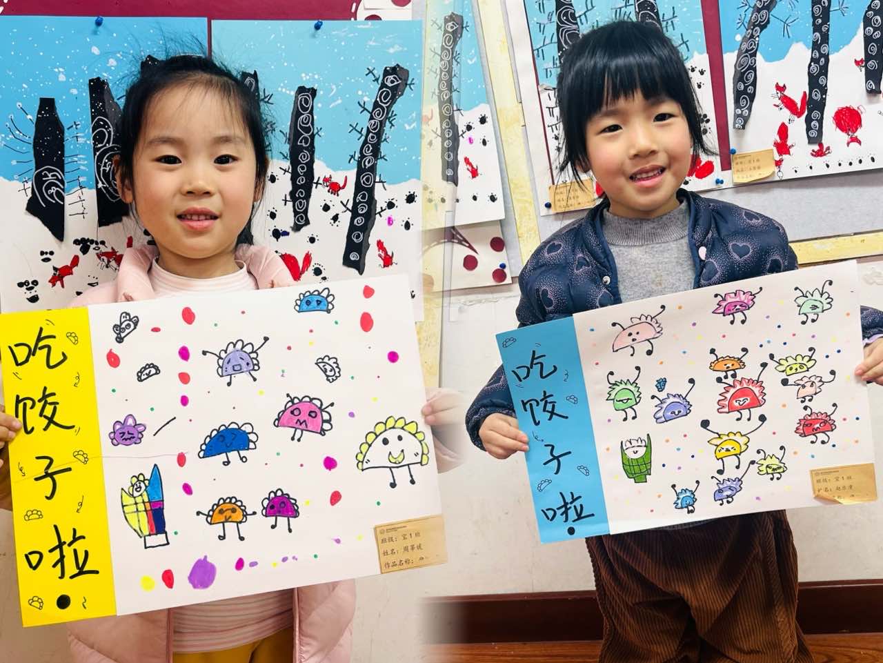 而最让人惊喜的,是餐后这场《吃饺子啦》的创意美术课--当画笔遇上饺子,一切都变得不一样了:有的饺子长出了彩色的小翅膀,有的变成了圆滚滚的小怪兽, 有的裹上了彩虹外衣,还有的在画纸上跳起了欢快的舞蹈。 孩子们用大胆的线条、鲜艳的色彩,把对饺子的喜爱, 变成了一幅幅充满生命力的作品。