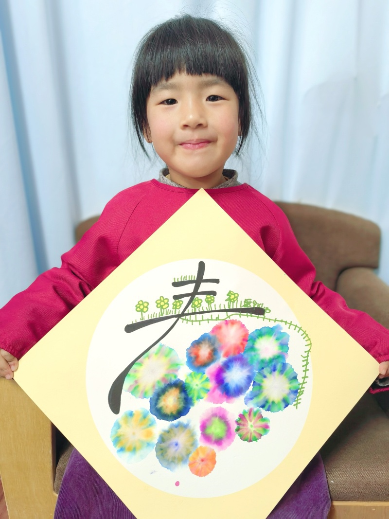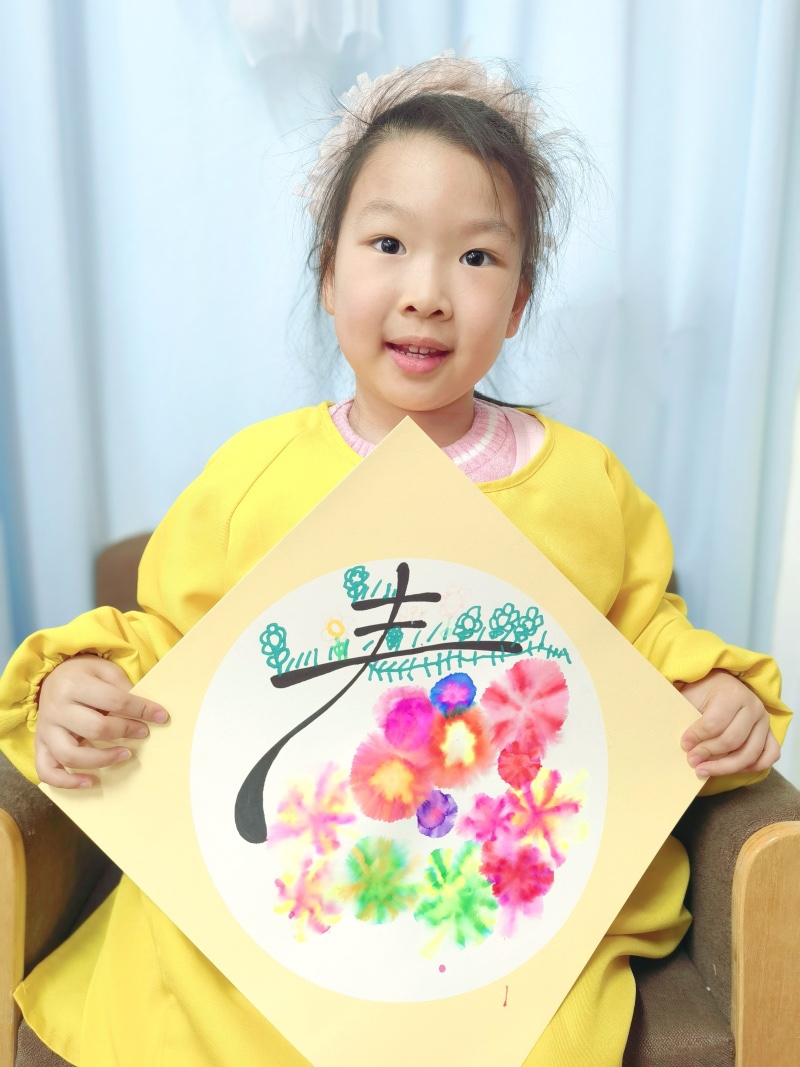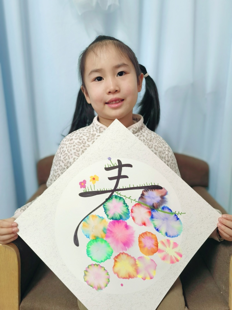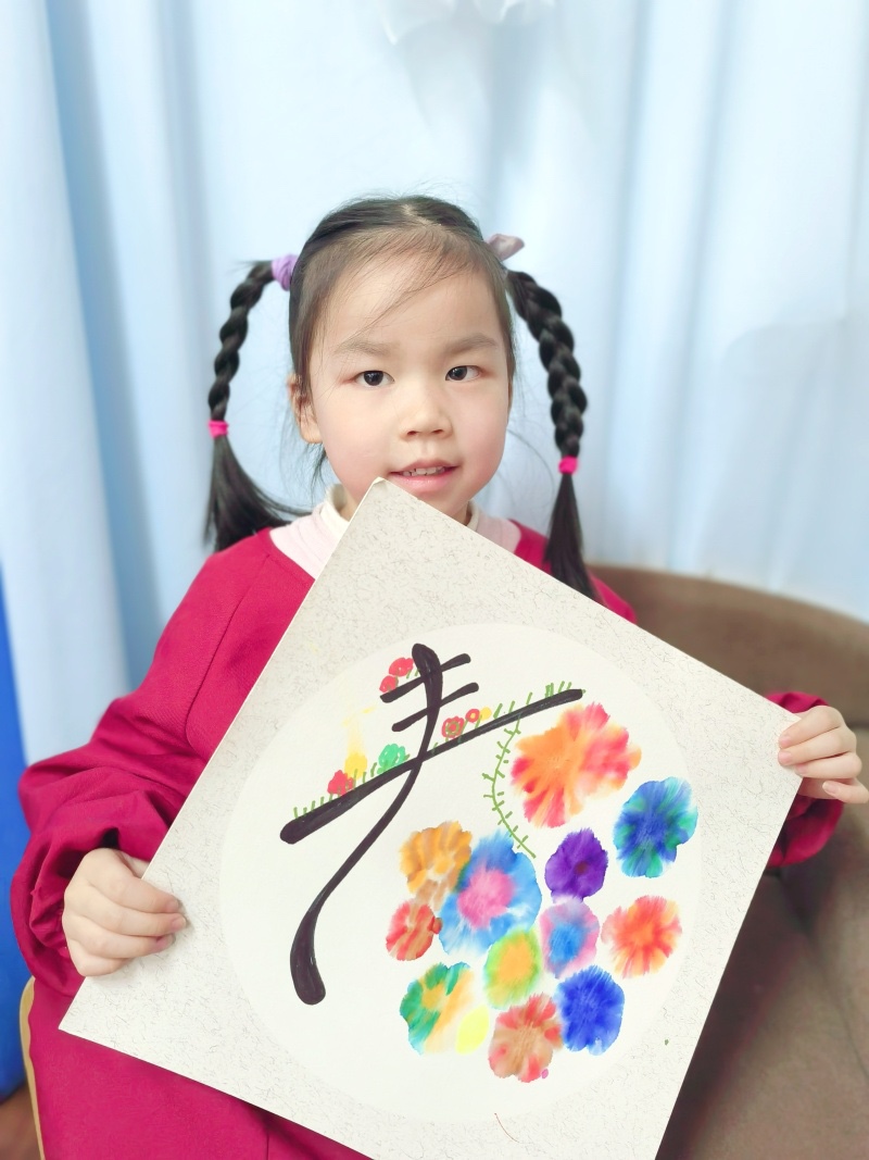 每一幅作品里,都藏着孩子们对春天的独特感知:晕染开的斑斓花朵,是春风吹开的烂漫繁花,粉、橙、蓝、绿交织成春日的调色盘;精心勾勒的藤蔓与小花,是枝头冒出的新芽与花苞,诉说着万物生长的喜悦;苍劲的“春”字与灵动的色彩碰撞,让汉字之美与自然之趣在纸上温柔相拥。