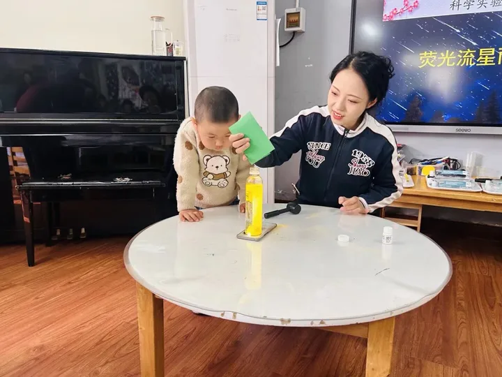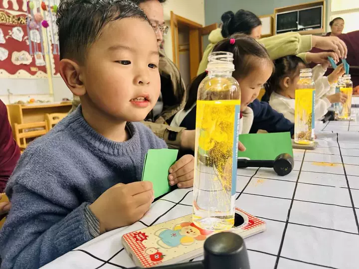 室内的科学小课堂,更是点燃了宝贝们的探索欲!老师带着大家一起做「荧光流星雨」小实验,透明的瓶子里,黄色的“流星”缓缓下落,像把整片星空装进了瓶子里,宝贝们的眼睛里都闪着好奇的光~