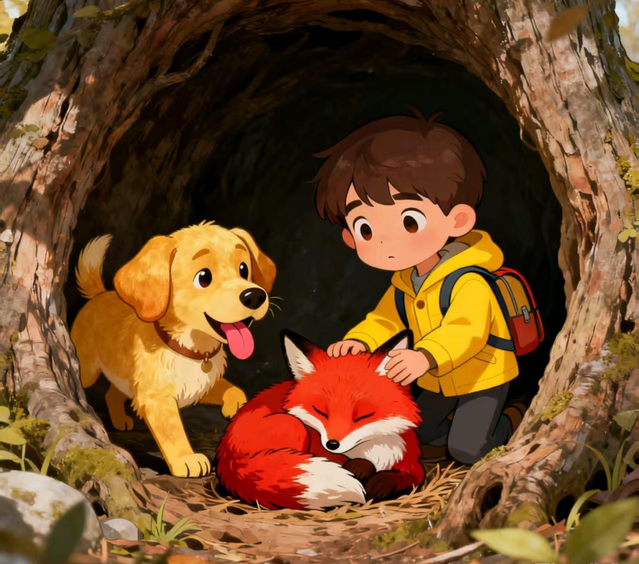 乐乐对忠忠说,“我们一起帮它找妈妈,好吗?”忠忠好像听懂了似的,“汪!”地叫了一声,用鼻子轻轻嗅了嗅小狐狸。从那一刻起,忠忠就承担起了守护者的责任。它走在乐乐和小狐狸中间,像一个忠诚的小卫士。他们走啊走,穿过沙沙作响的杨树林,跨过铺满银杏叶的小路。每当风吹落一大片叶子,发出“哗啦”的声音时,小狐狸都会害怕地缩起来。这时,忠忠就会走过去,用自己温暖的身体蹭蹭它,好像在说:“别怕,有我在呢。”