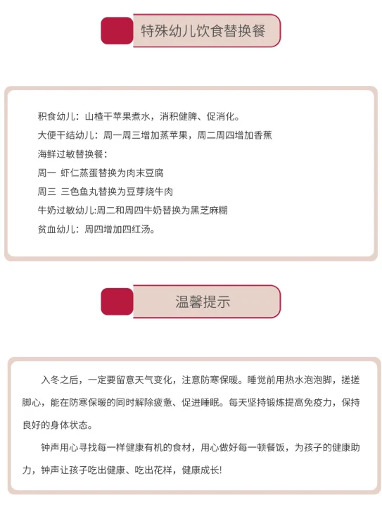 小雪启冬,寒意渐浓。 宝贝们的冬日健康,从均衡饮食开始。我们遵循时节养生原则,精选温热滋补的应季食材,搭配谷、肉、蛋、蔬、果五大营养素,从温热应季食材到个性化饮食调整,每一口都是科学配比的营养与暖意,每一份餐食都藏着科学配比的用心,让宝贝们在舌尖感受温暖的同时,吃得营养、吃得安心,元气满满度过冬日时光。