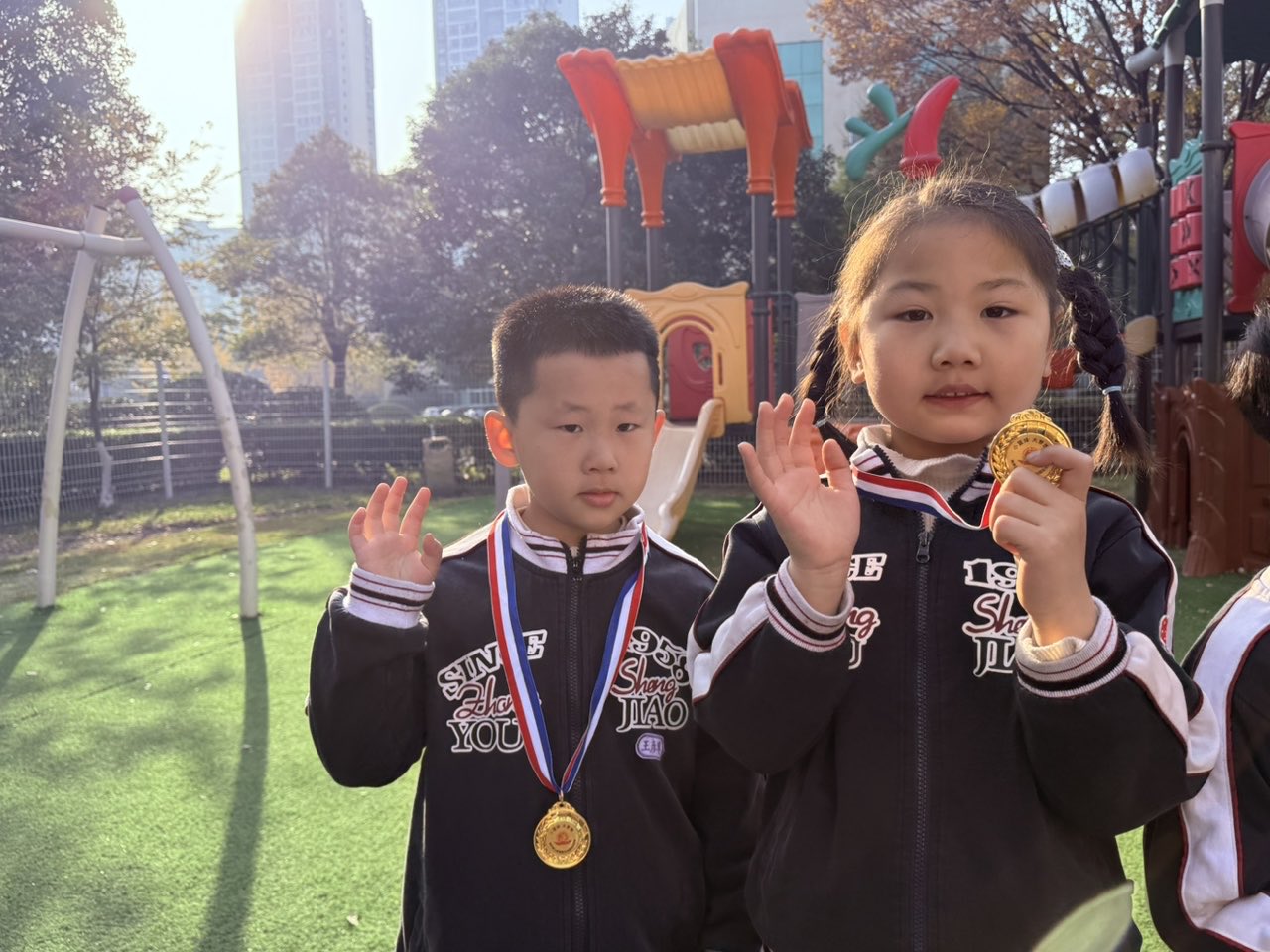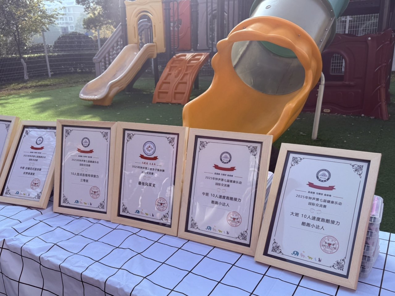 今天的奖牌挂在脖子上沉甸甸,证书捧在手里亮堂堂:有“最佳拼搏奖”的汗水,有“苗苗奖”的可爱,有“酷跑小达人”的飒爽,还有集体项目里“最佳风采奖”的默契——每一份荣誉,都是这个秋天最甜的收获!你看!有的小朋友攥着奖牌舍不得松手,有的举着证书笑出小酒窝,还有的凑在一起“炫耀”彼此的奖状——连老师都被这股开心劲儿传染啦!