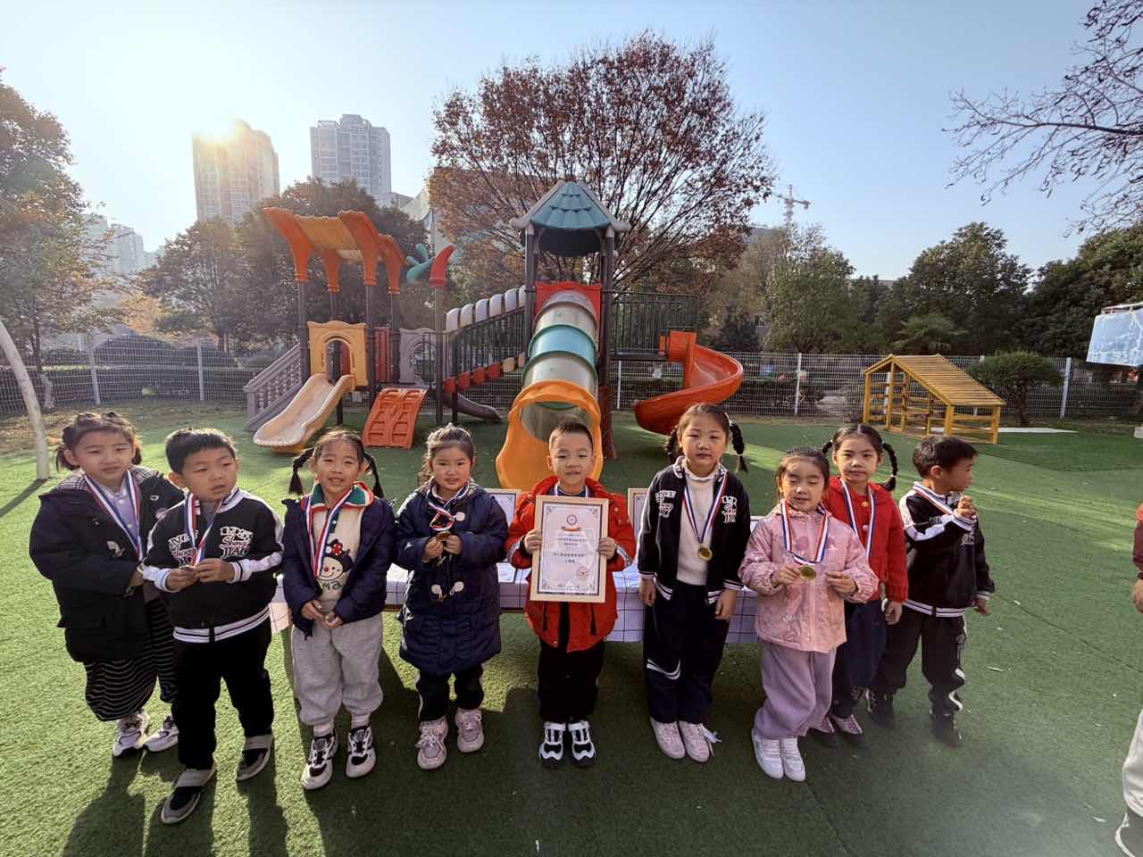 你看!有的小朋友攥着奖牌舍不得松手,有的举着证书笑出小酒窝,还有的凑在一起“炫耀”彼此的奖状——连老师都被这股开心劲儿传染啦!