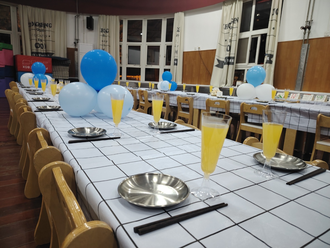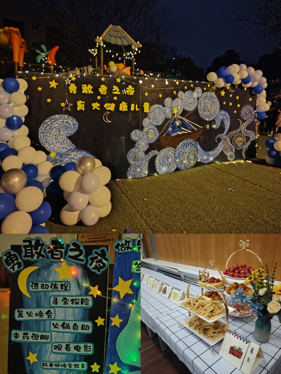 为了让孩子们沉浸式感受勇敢者的探索氛围,幼儿园进行了精心的环境布置。深蓝色的星空背景板搭配星星灯、蓝白气球错落点缀,“勇敢者之夜”的主题标语醒目亮眼,手绘的海浪、船帆造型童趣十足,仿佛将孩子们带入了神秘的冒险世界。室内餐饮区则以格子桌布、精致餐架打造出温馨的长桌宴氛围,薯条、水果、火锅食材等丰富餐食整齐摆放,为孩子们的冒险之旅储备满满能量。
