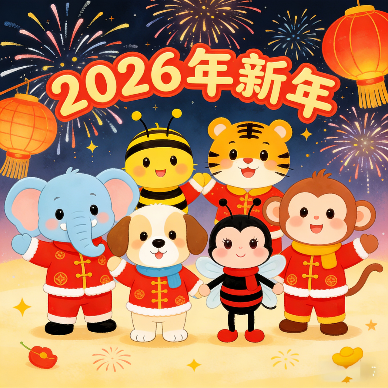 六个好朋友手拉手,在钟声幼儿园里唱歌、跳舞、吃糖果。感恩、勤劳、自信、诚信、合作、智慧,一个都不少!新年快乐,团团圆圆,这就是吉祥物们最甜蜜、最快乐的新年!