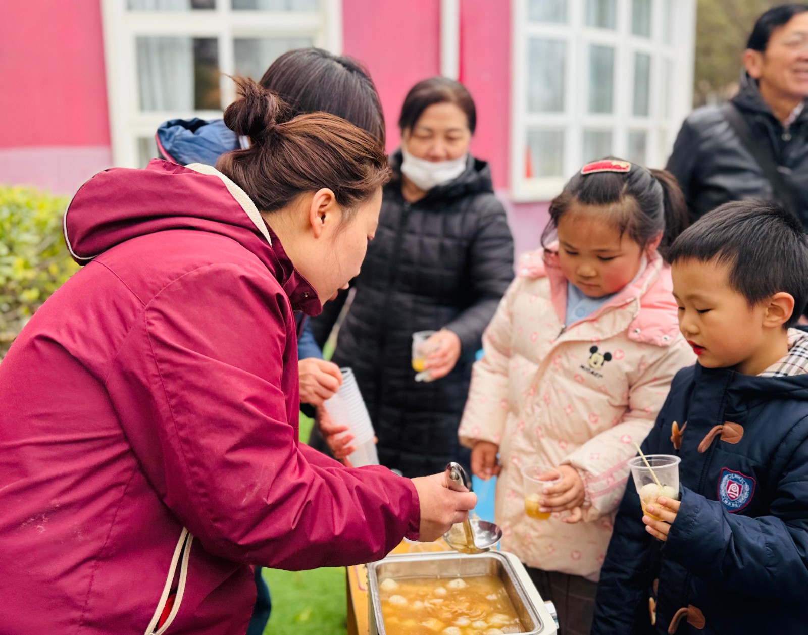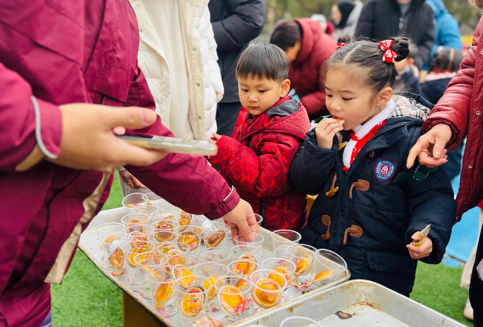 热闹的民俗表演过后,最受孩子们期待的“年货美食一条街”正式开业。在这里,传统的年味化作了舌尖上的美味。老师们化身“暖心摊主”,为孩子们递上一碗碗香甜的汤圆,圆润的汤圆在热水中翻滚,寓意着新一年的团团圆圆。除了甜蜜的汤圆,市集上还有各种各样的特色小零食,孩子们拿着猜灯谜赢来的兑换券,穿梭在各个摊位之间,挑选着心仪的奖品与美食,小小的手掌里,攥着的是满满的幸福与喜悦。