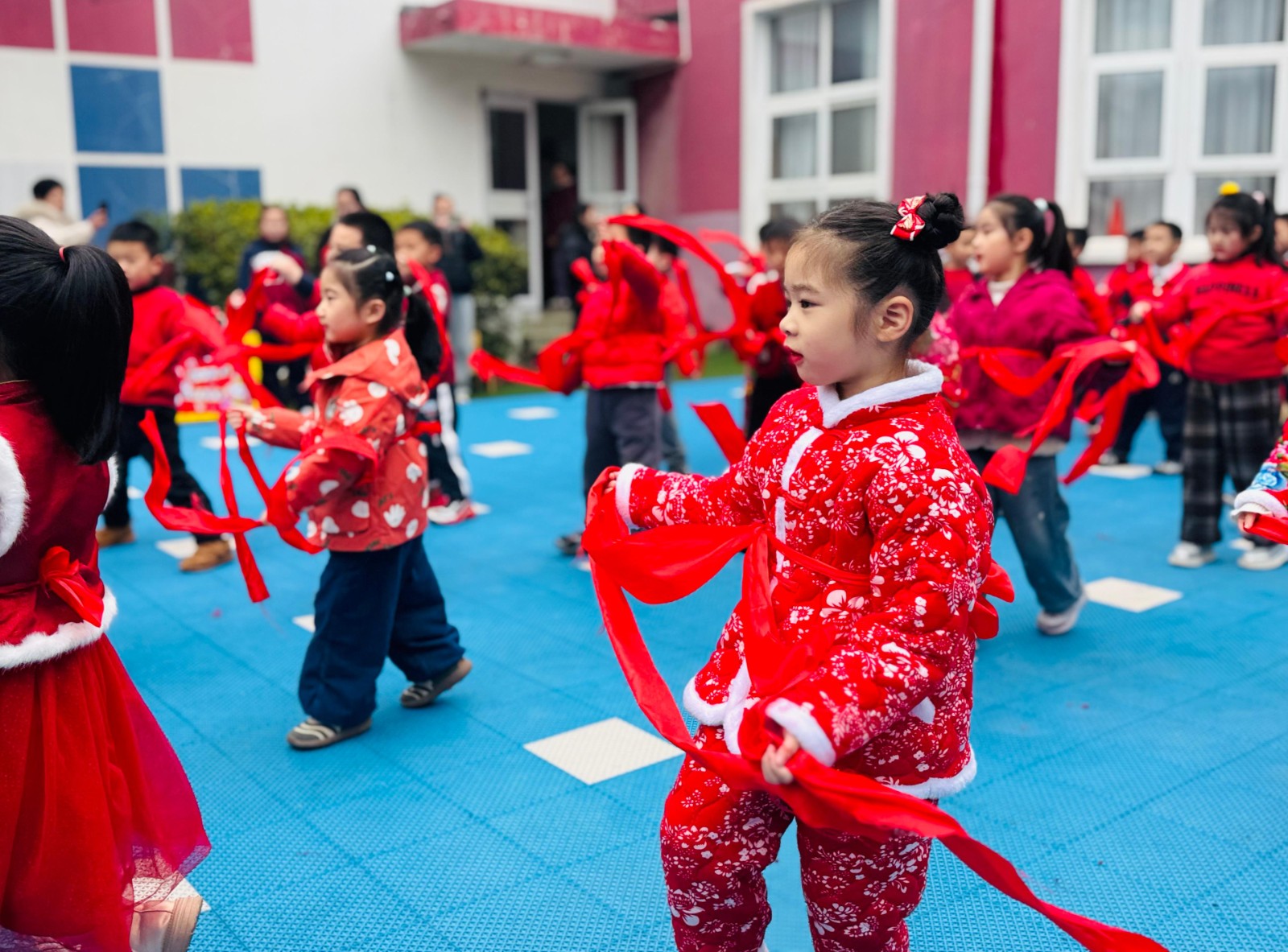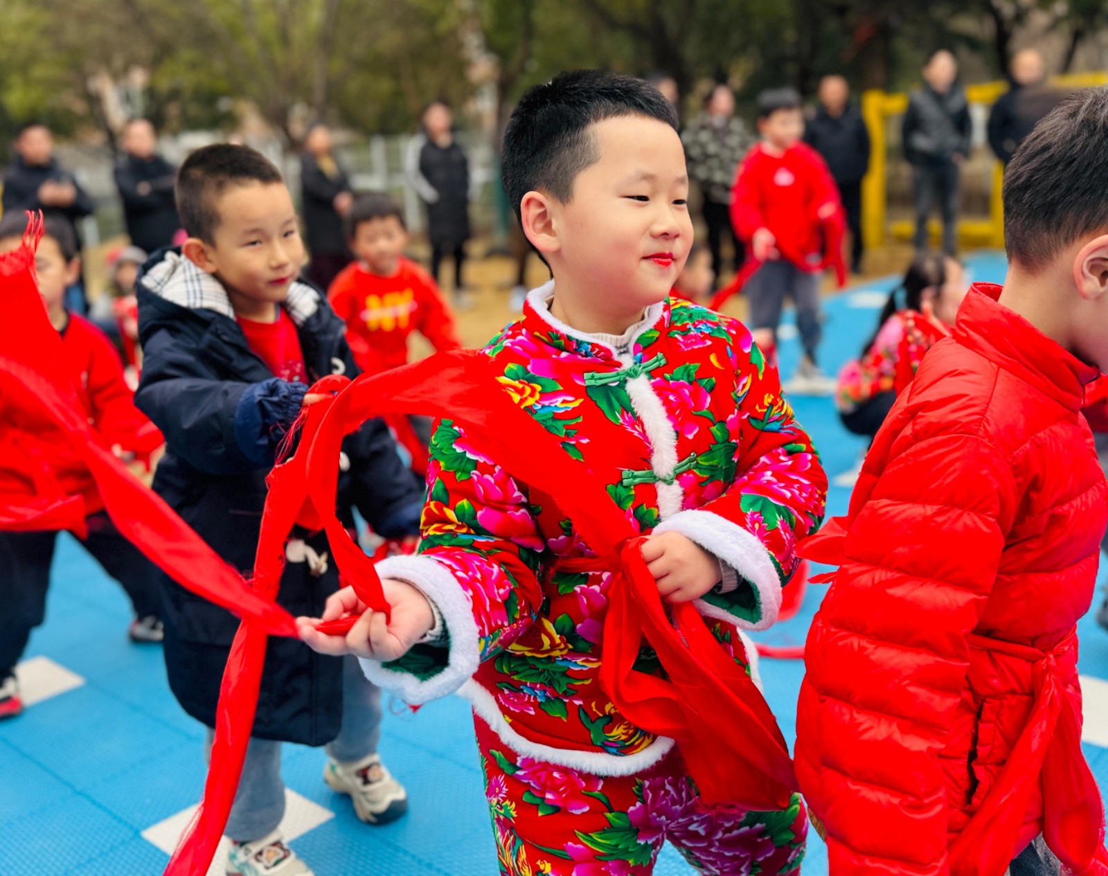 舞龙表演刚落幕,欢快的秧歌声便响了起来。一群穿着喜庆红棉袄的小朋友们,手持火红的绸带,扭起了秧歌。红绸翻飞如流霞,脚步轻盈似蝴蝶,孩子们跟着节奏摆腰、踢腿,脸上洋溢着自信的笑容。小宝贝们动作憨态可掬,将现场的欢乐气氛推向了高潮。