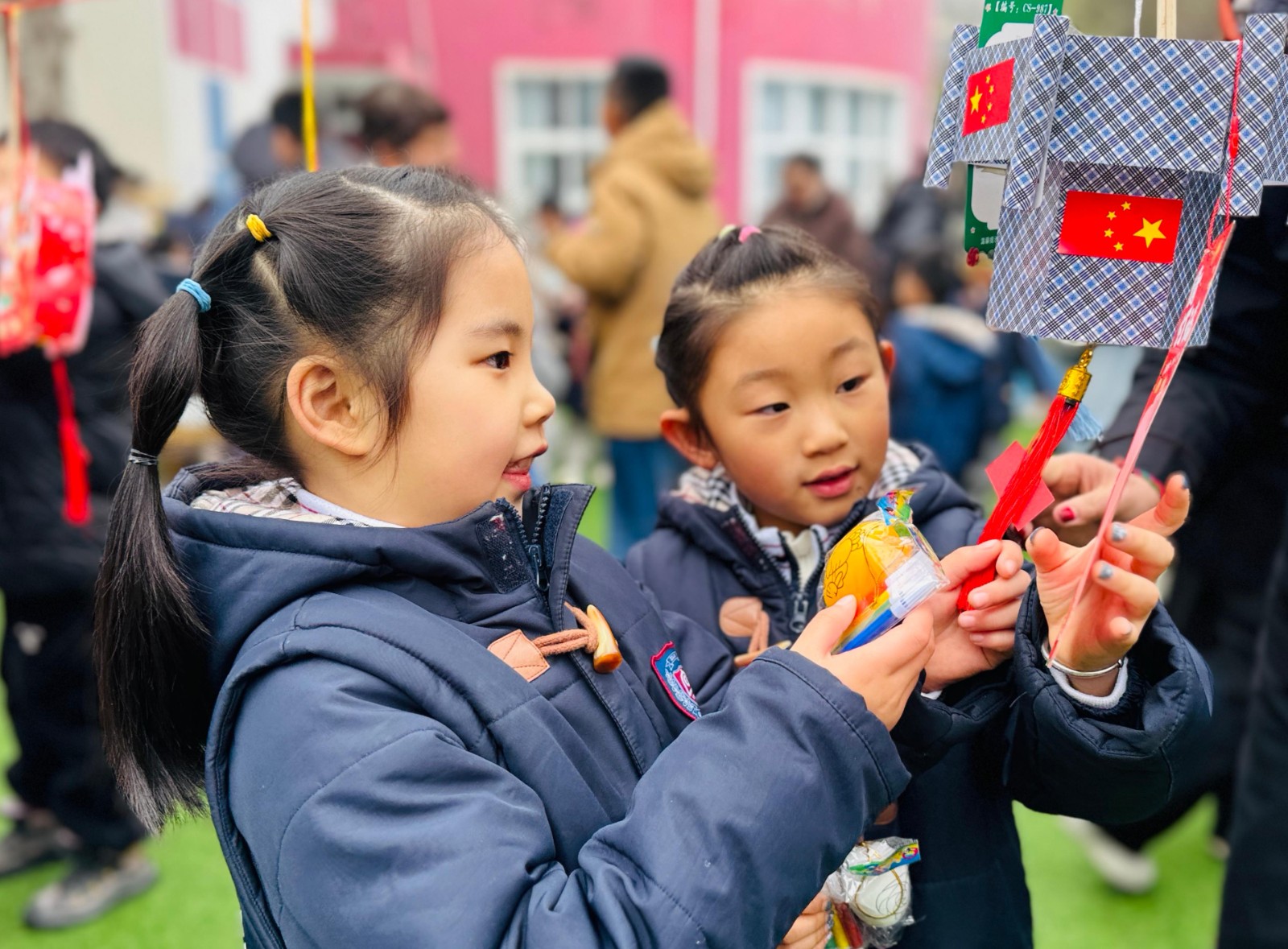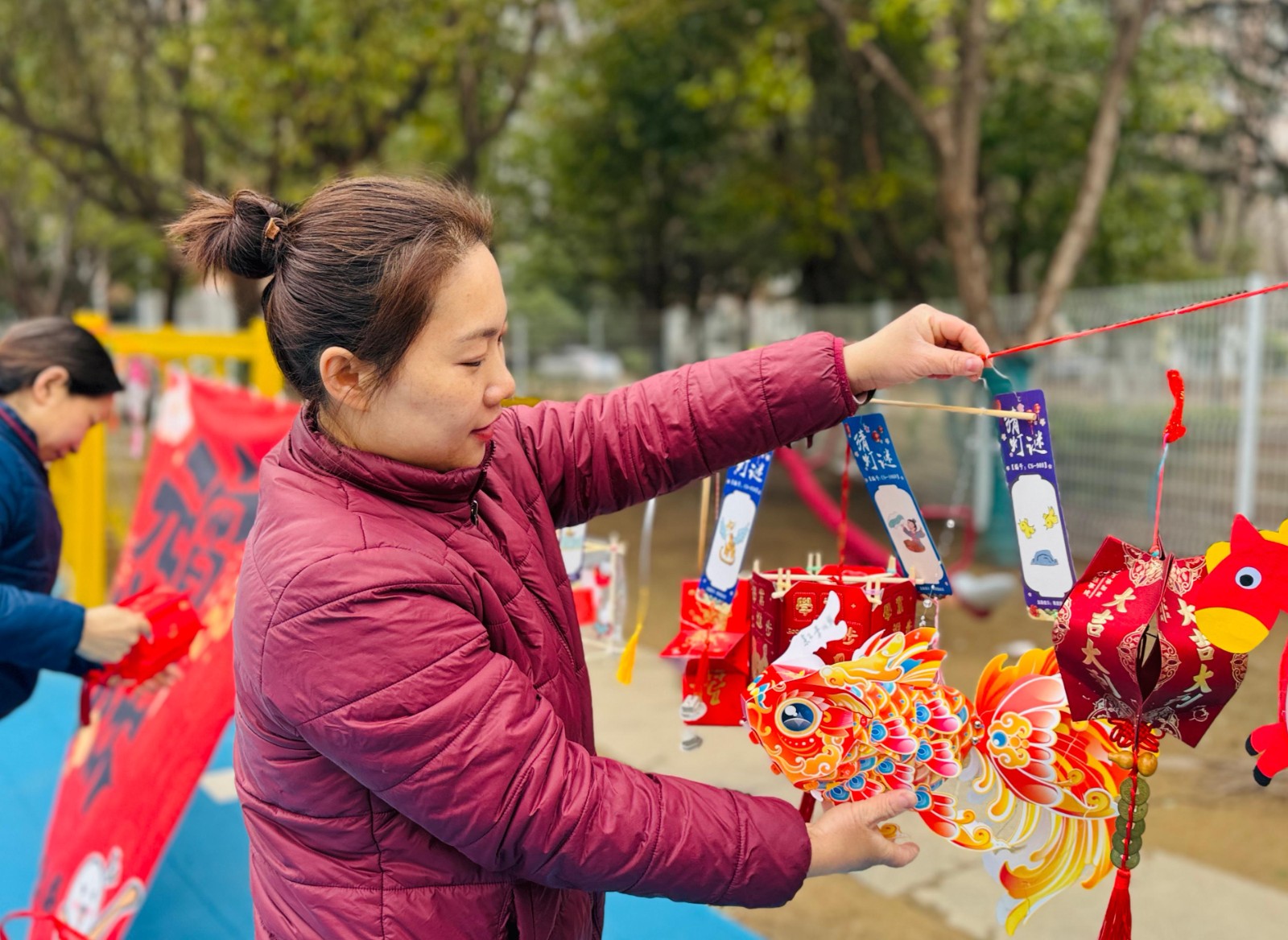来到操场,节日的氛围感扑面而来。五彩斑斓的花灯长廊下,醒狮灯、锦鲤灯、宫灯错落悬挂,金色的流苏随风摇曳,宛如一片流动的星河。长廊间的红丝线上,挂满了精心准备的灯谜,从趣味字谜到生活常识,每一张彩笺都藏着智慧的密码,静待着小探险家们前来解锁。