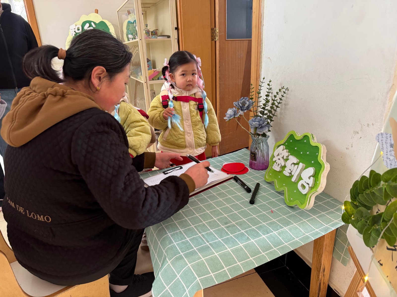 小小的签到台,藏着满满的仪式感。宝贝们在家长的陪伴下认真签到,用独特的方式留下自己的入园痕迹,正式开启这场温暖的初见,每一个签名、每一个小贴纸,都是成长的第一步。