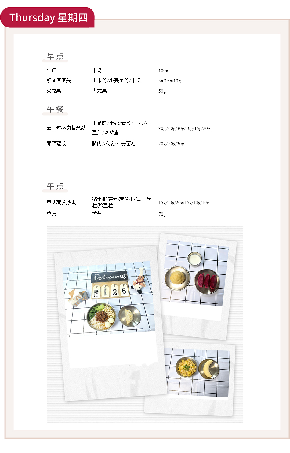 点心:葱香虾皮千层饼、百香果酸汤肥牛粉、萝卜虾皮春卷、泰式菠萝炒饭、香菇糯米烧麦(小巧精致,能量适中,方便孩子抓取食用)