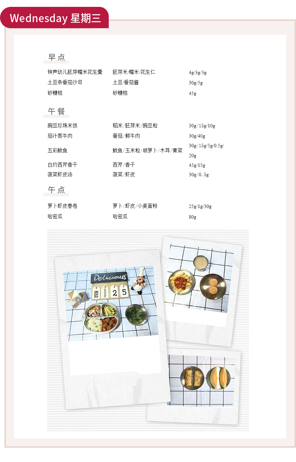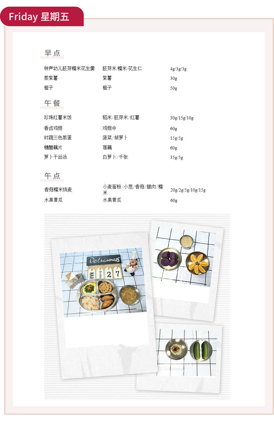 点心:蒸玉米、豆腐卷、土豆条番茄沙司、奶香窝窝头、蒸紫薯(口感软糯易咀嚼,呵护娇嫩肠胃)
