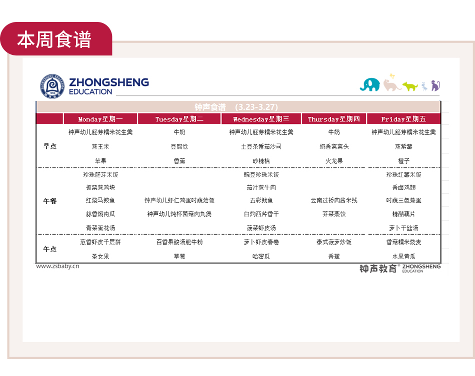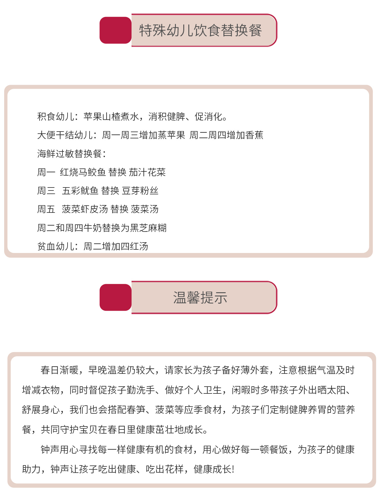 钟声教育以科学营养为理念,为孩子们定制三餐两点的暖心餐单,食材新鲜多样、搭配均衡,助力孩子在春日渐暖时吃得香、长得棒!