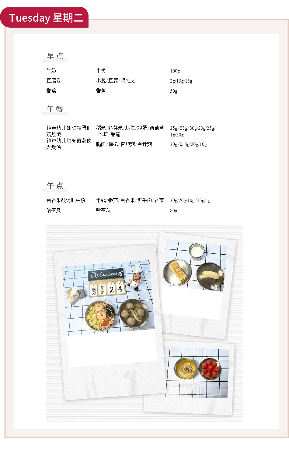 每日早点以温和的胚芽糯米花生羹搭配热牛奶,温柔唤醒孩子的肠胃,再佐以软糯点心与清甜水果,为清晨注入满满元气: