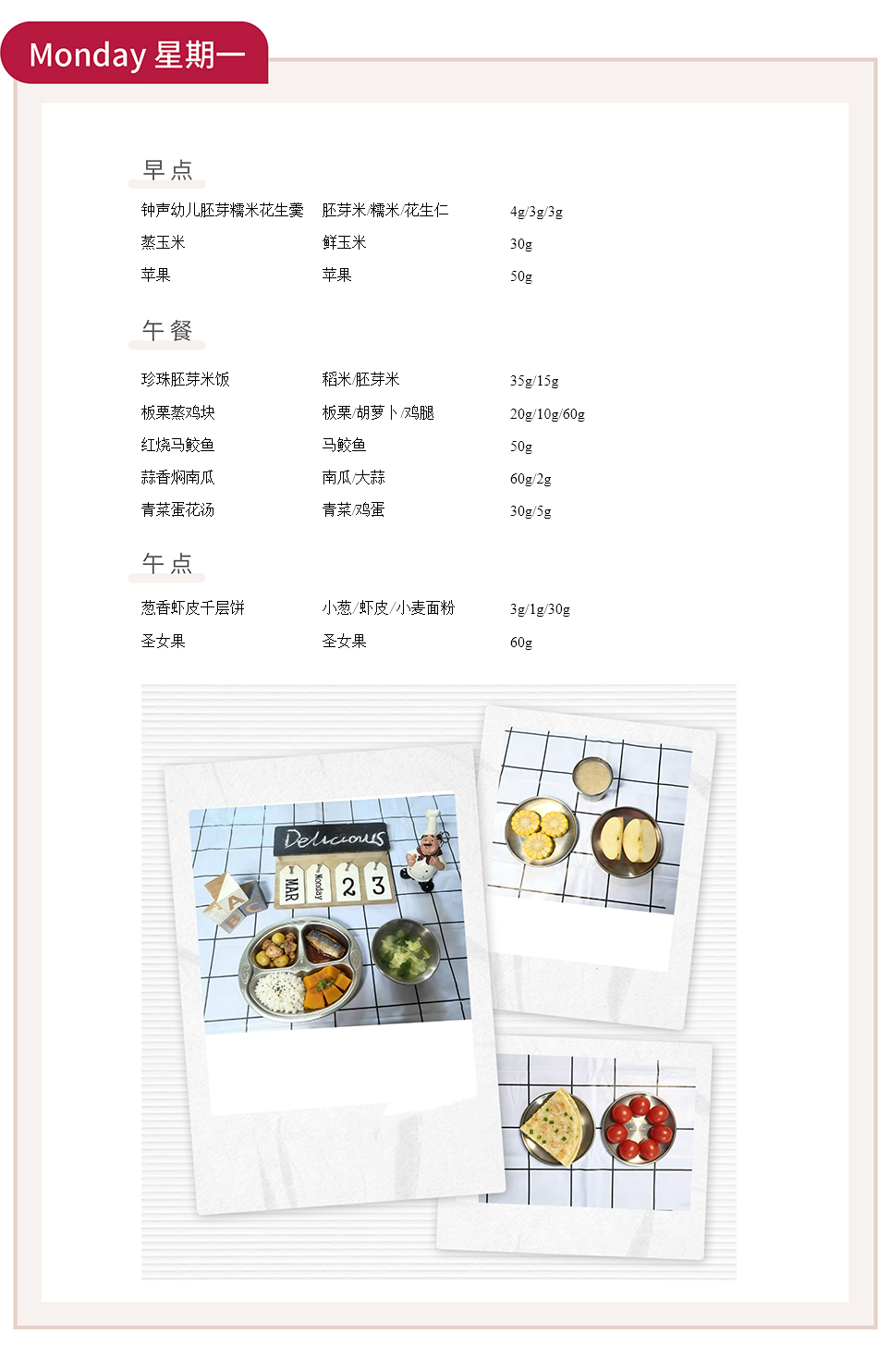 主菜:板栗蒸鸡块、红烧马鲛鱼、蒜香焖南瓜;钟声幼儿炖怀菌菇肉丸煲;茄汁蒸牛肉、五彩鱿鱼、白灼西芹香干;荠菜蒸饺;香卤鸡翅、时蔬三色蒸蛋、糖醋藕片(精选优质食材,清淡鲜美,营养均衡)