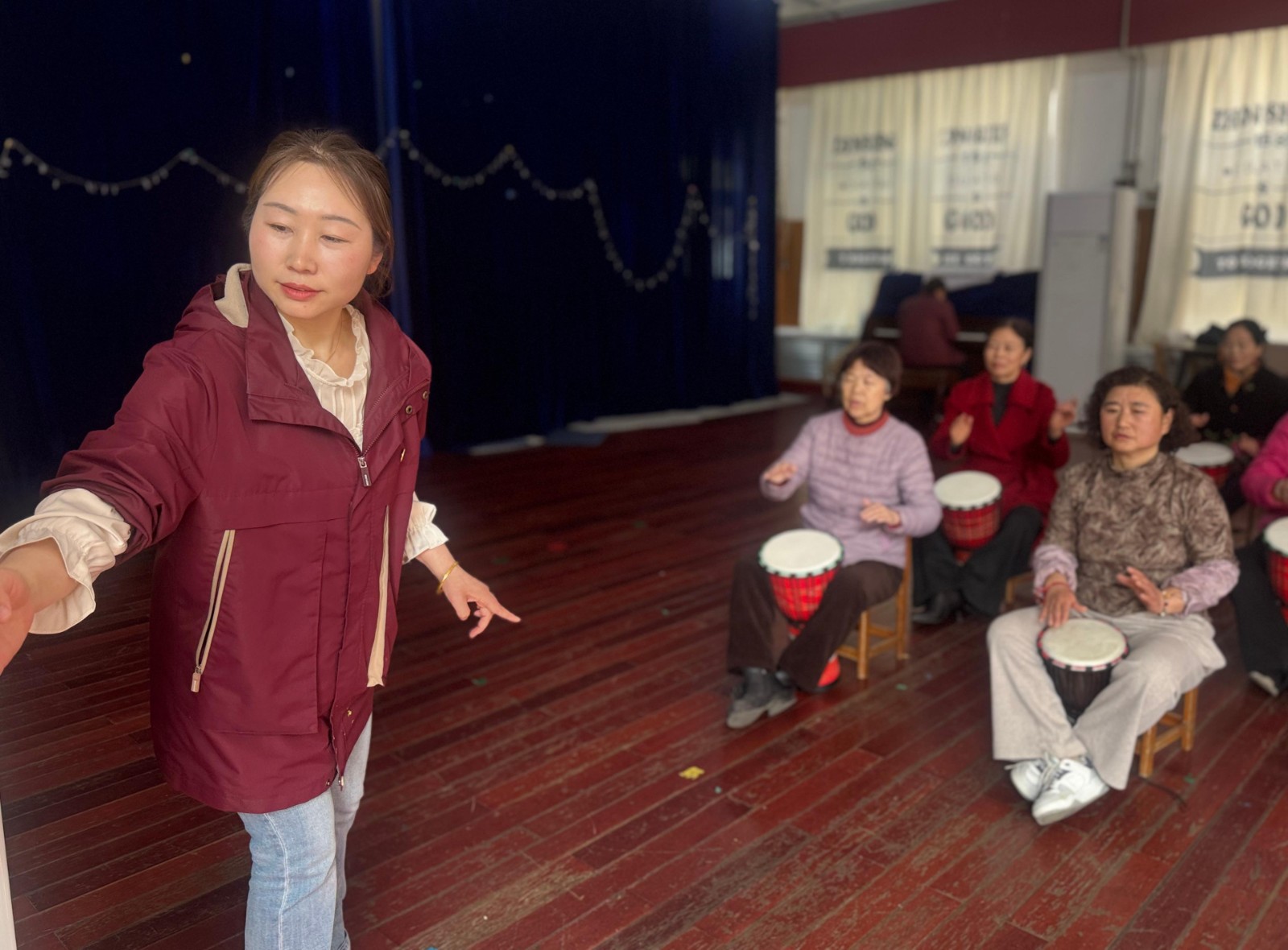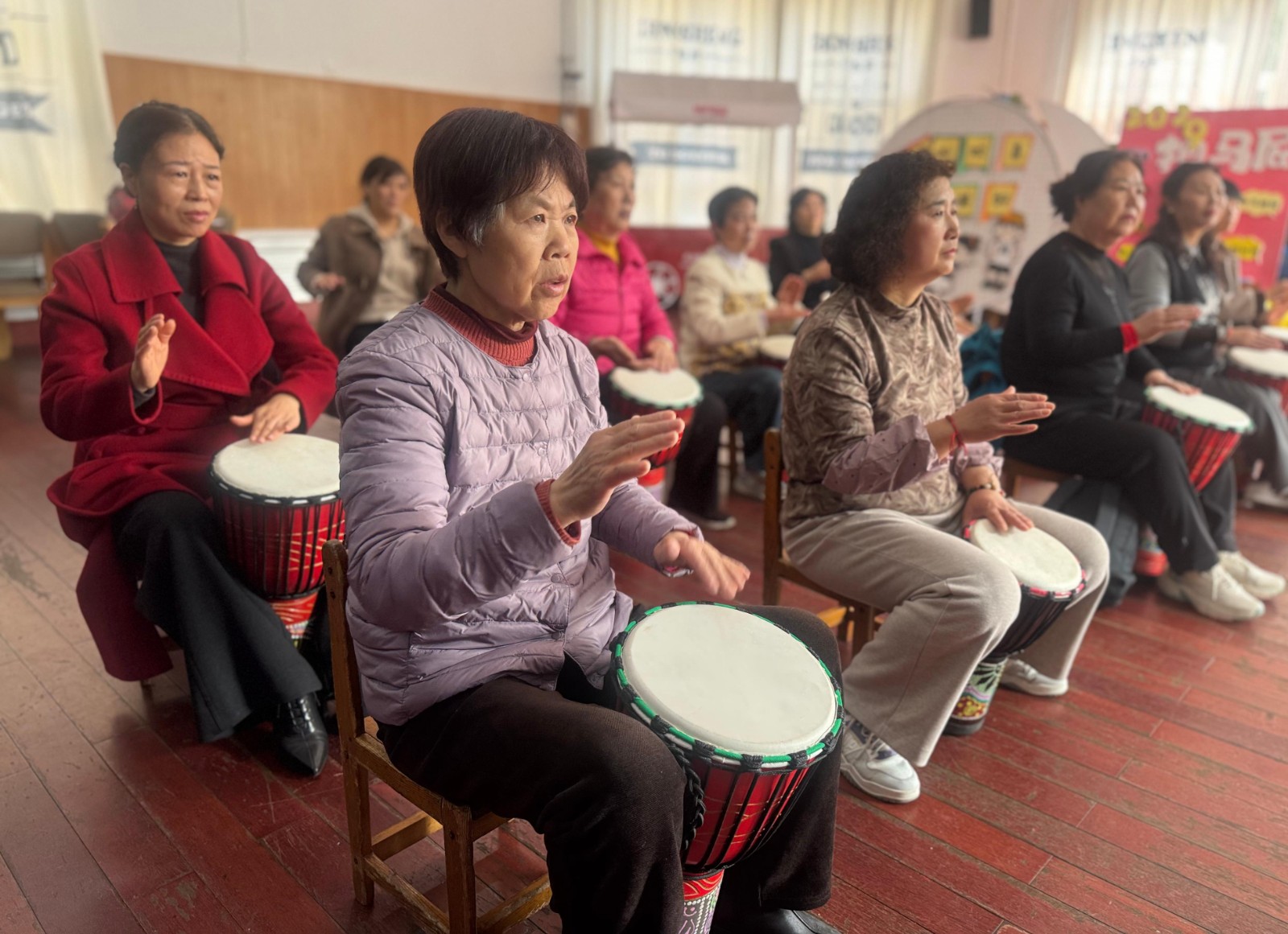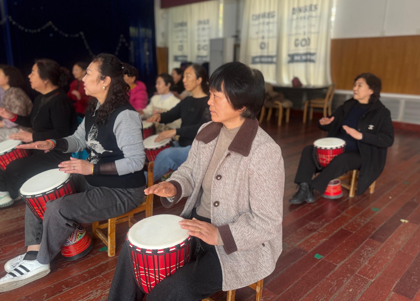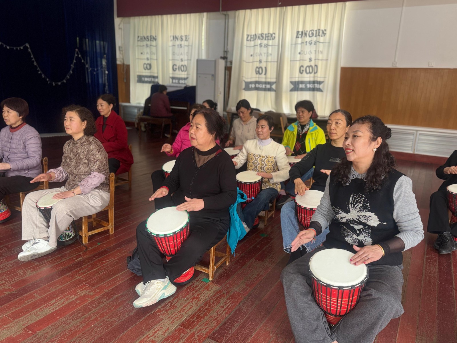 课堂上,奶奶们精神饱满、热情高涨。在非洲鼓课程中,她们认真聆听老师的讲解,从基础节奏到完整曲目,一步步学习、一遍遍练习。伴随着欢快的鼓点,大家双手起落、节奏整齐,鼓声铿锵有力、充满力量。每一次敲击,都传递着积极向上的生活态度;每一段旋律,都展现着热爱生活的美好情怀。奶奶们专注的神情、投入的姿态,成为校园里一道温暖而动人的风景。